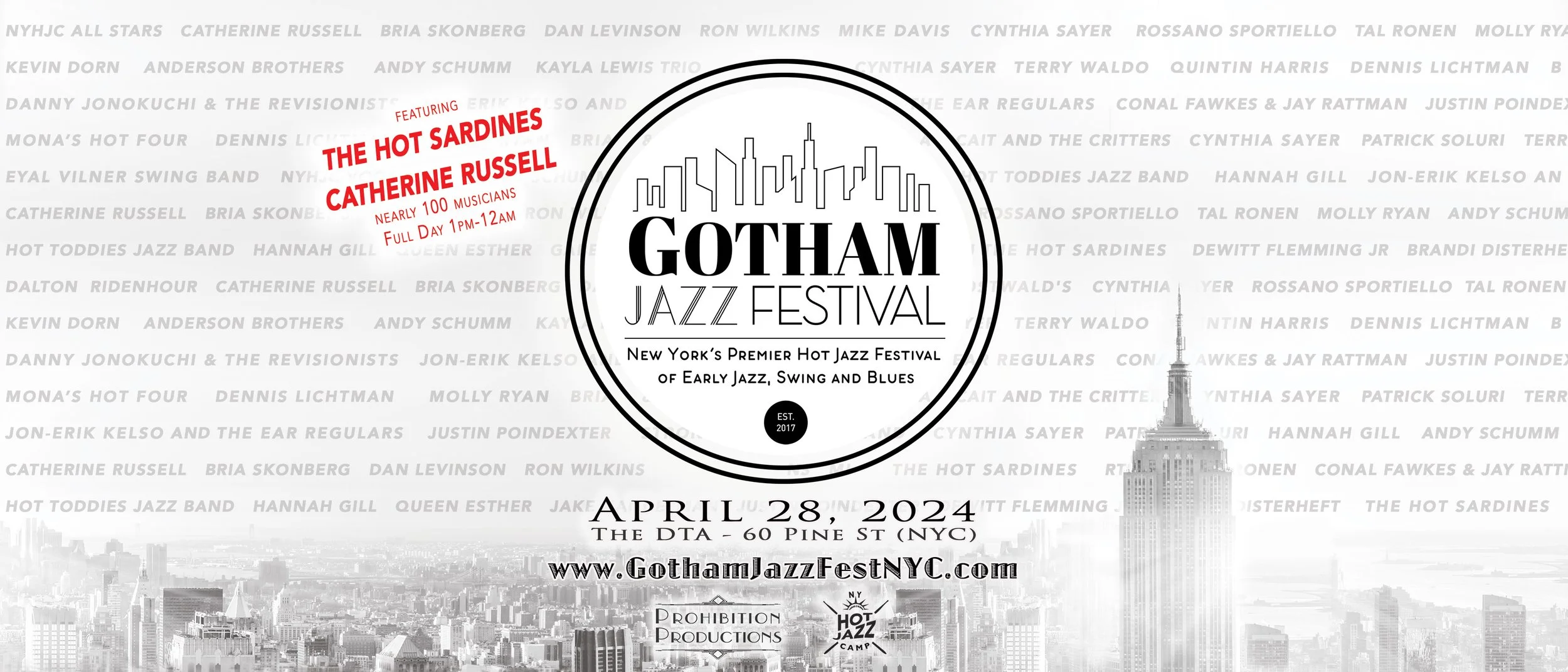 The twenties roar again at the 6th annual GOTHAM JAZZ FESTIVAL with 11 hours of dancing, lounging, n' listening to nearly two dozen of NYC's best hot jazz & swing bands… well over 100 musicians!